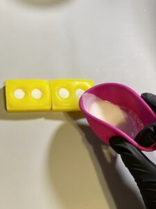 - Heat white isomalt to a boil then let it settle for about 2 minutes. Pour into holes until full. Let it cool for about 5-10 minutes.