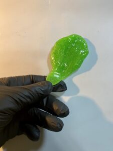 - Heat your clear isomalt and color it green, then let it settle for about 2 minutes. Start the pulling process and leave under the heating lamp. Take your thumb and index finger and gently pull a piece of the isomalt. Then take your scissors and cut at an angle on the pulled section.