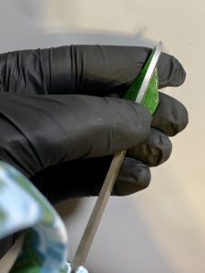 - Take your scissors and gently press down the center of the pulled isomalt piece. Then bend and twist to the desired shape. Repeat the process to make 2-3 leaves per flow.