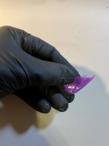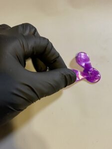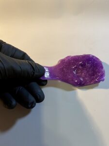 - Heat clear isomalt and add purple airbrush coloring. Start the pulling process. Take your thumb and index finger and gently pull a piece of the isomalt. Then take your scissors and cut at an angle on the pulled section.