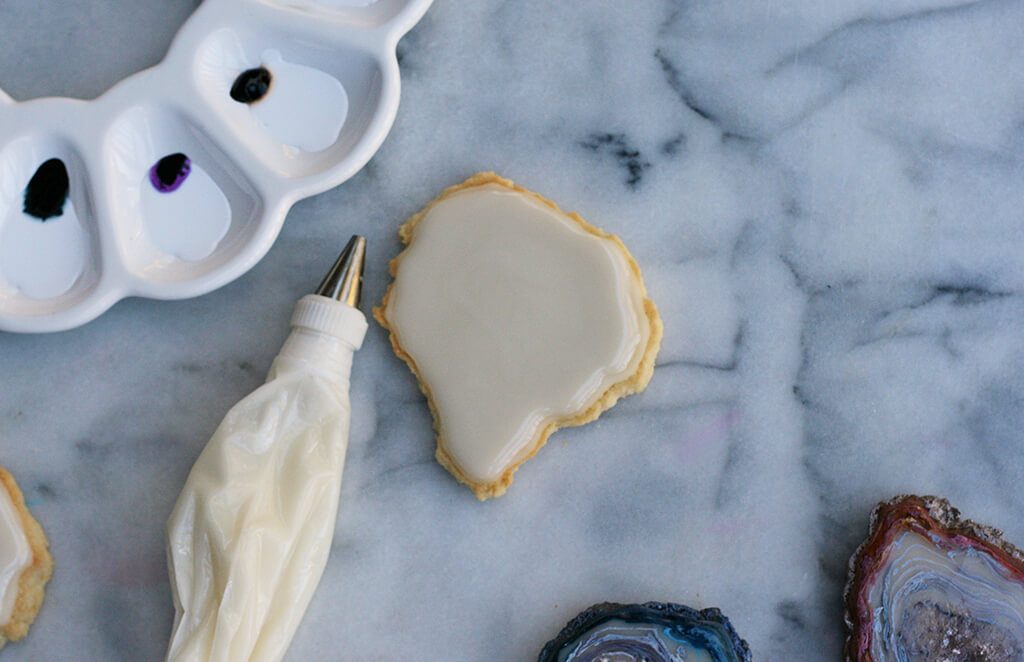 Using a toothpick dipped in your preferred gel colors, run the toothpick through your icing in a circular pattern, creating a natural agate pattern. To make them look more realistic, use different shades of your chosen color and follow the natural shape of your torn cookie.