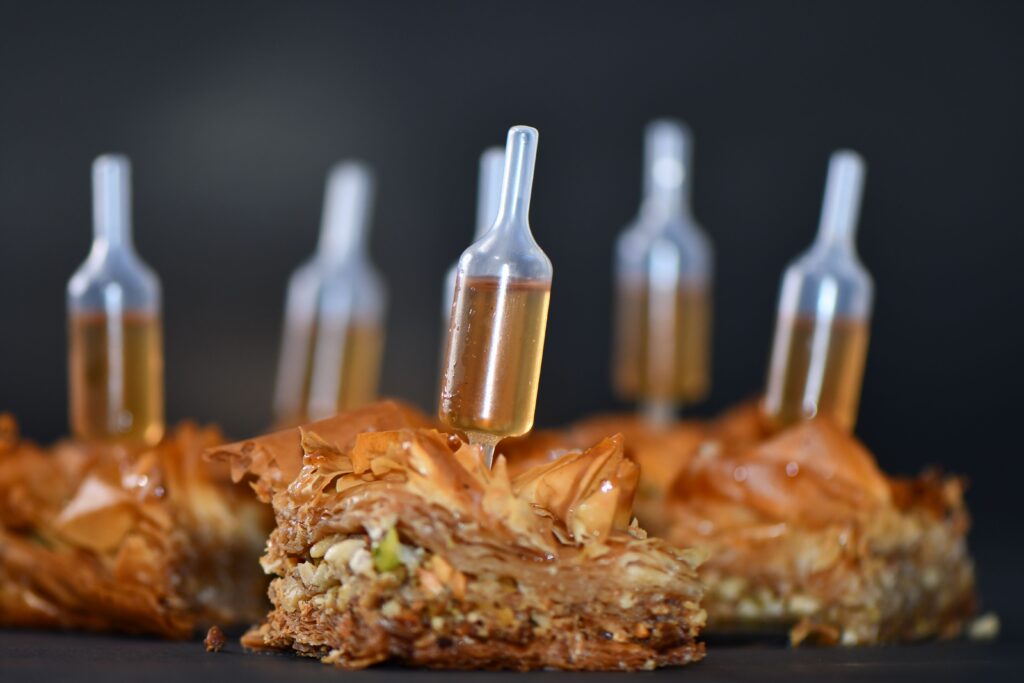 - When ready to serve the paklava, fill pipettes with the drink and stick them into the paklava slices.