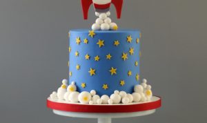 7.Push the rocket topper into the top of the cake, leaving about an inch clearance.