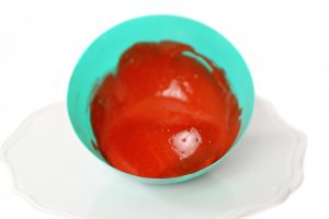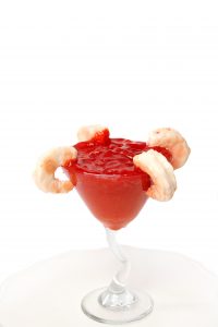 10) Add the mirror-glaze mixture on top of the martini cake, and place the shrimp as desired. Your “shrimp cocktail” is ready to serve.