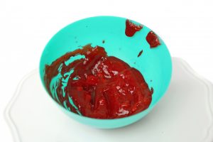 7) Take ¼ cup of clear mirror glaze and add one drop of red gel food color and one drop of orange gel food color. Mix well to combine. In a food processor, place a waffle cone and ¼ cup of brown sugar and pulse to crumble. Fold in a little of the dry mixture to the mirror glaze a little at a time until a cocktail-sauce consistency is achieved.
