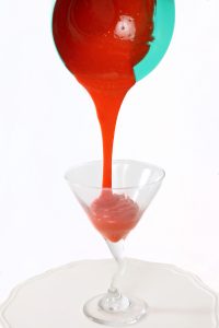 10) Add the mirror-glaze mixture on top of the martini cake, and place the shrimp as desired. Your “shrimp cocktail” is ready to serve.