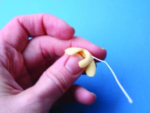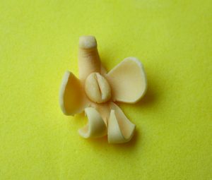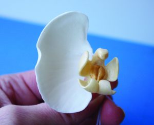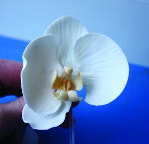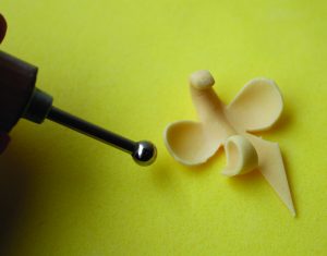 5. Curve the top down toward the center and place a small ball of yellow gum paste in the center of the lip to make the heart of the orchid. Use a palette knife to draw a line down the heart’s center. Then insert a wire through the top of the center.