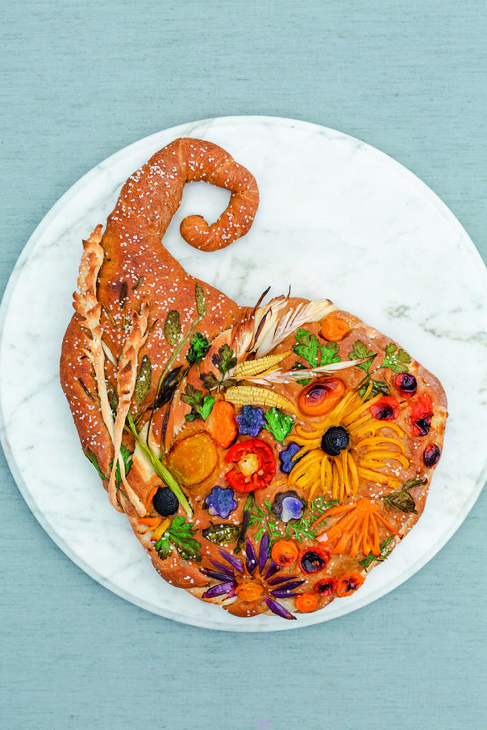 This attractive focaccia filled with colorful vegetables and flowers will complement any fall feast.