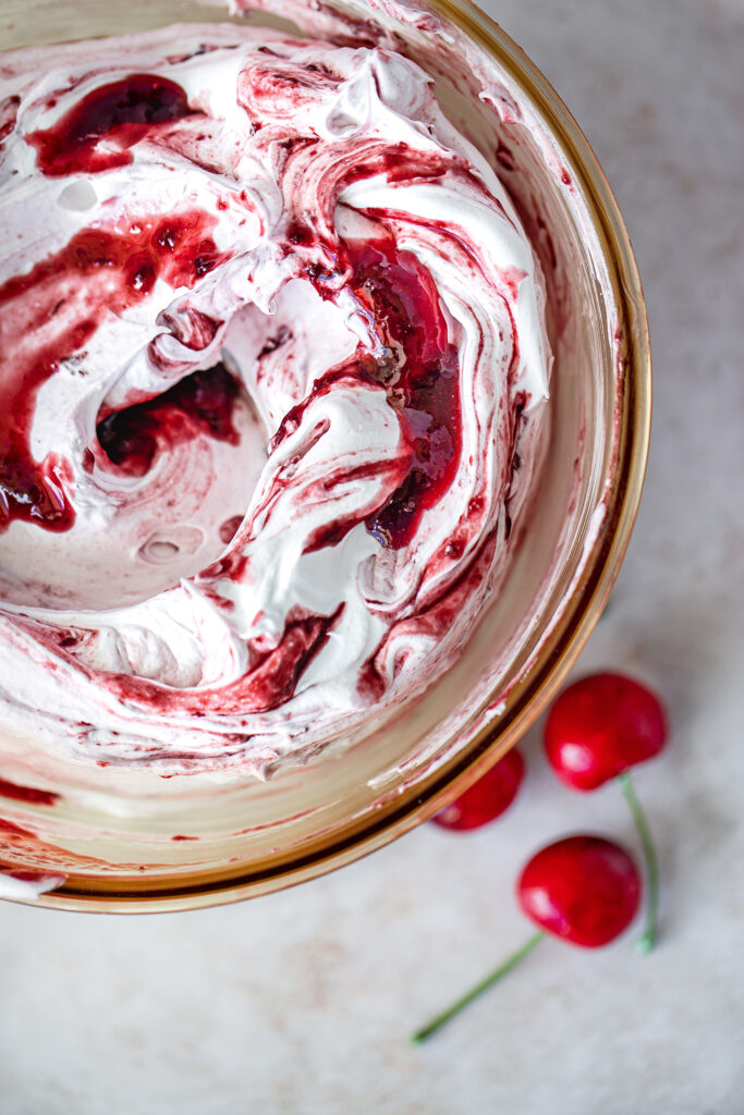 - Gently fold the cherry filling into 1 of the bowls of Whip’n Ice until you reach your desired swirl effect.