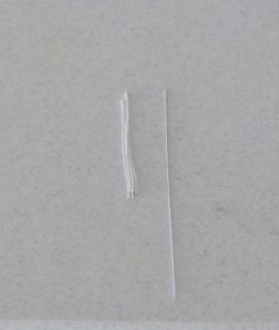 Take 8 stamen and a 10 cm length of 28-gauge wire. Fold the stamen in half and thread the wire through the loop. Tape over the bottom of the stamen and down onto the wire. Make 10-12 flower centers.