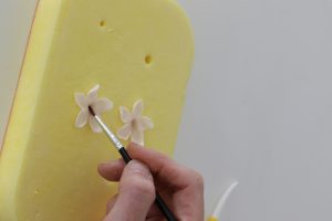 Thread the stamen down through the middle of both petal sets and secure in place underneath by twiddling the paste around the wire using your fingers. Remove any excess paste. Turn the blossom upside down and stick into a polystyrene dummy to dry.