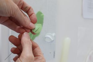 Place the leaf in a veiner and press the pattern into the paste. Soften the edges on a foam pad, pinch the end and set it aside in a cake dummy to dry.